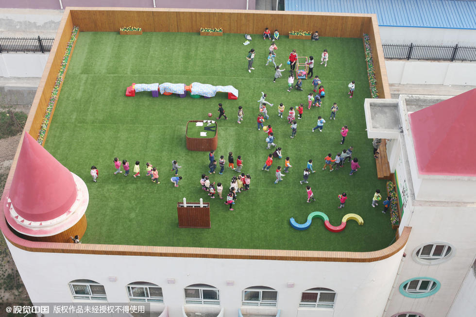 2015年10月20日,陜西省西安市西影路一幼兒園的小朋友們在屋頂操場打球,翻跟斗,做游戲,捉迷藏…… 玩夠了,跳累了,躺在屋頂曬太陽。漂亮安全的屋頂操場成了孩子們的最愛。XHj安康新聞網(wǎng)