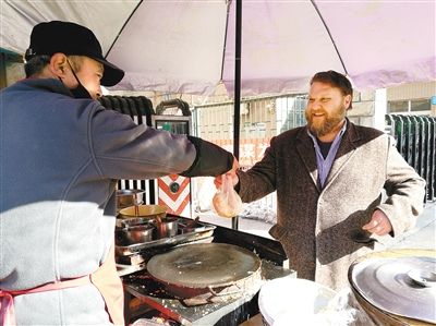 每天上午,只要有時(shí)間,他都會(huì)準(zhǔn)時(shí)來到西安外國語大學(xué)雁塔校區(qū)北門外,買一份煎餅果子當(dāng)早餐。煎餅攤的張老板和他是“老熟人”了。“我的中文全是在飯館點(diǎn)餐時(shí)練習(xí)出來的,比如‘泡饃’‘biangbiang面’‘肉夾饃’,全是我的最愛!奔s翰開玩笑地說,西安人的學(xué)習(xí)熱情很高,知道他來自美國后,通常會(huì)跟他練習(xí)英語口語,沒人找他聊中文。因此,他的中文水平至今也沒能提高多少!拔业母改、朋友來西安時(shí),我可是他們的美食導(dǎo)游。哪家羊肉泡饃好吃,我都清楚。”約翰笑稱自己已經(jīng)養(yǎng)成了“陜西胃”,特別愛吃西安的各類美食。