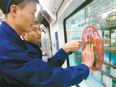 地鐵列車張貼剪紙窗花營造喜慶氛圍