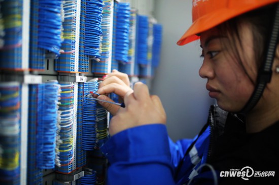 十多平米的設(shè)備房內(nèi)一片繁忙景象,四排信號機柜整齊排列,機柜里、地面上散落著很多線纜,每排柜子間都有一兩個忙碌的女工,她們神情專注,各色的線纜在手上飛舞。