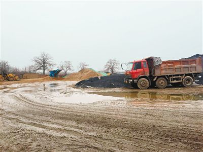 西韓路西側(cè)的料場(chǎng)內(nèi)泥濘不堪。 記者 馬昭 文/圖