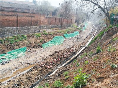 記者一行從位于臨潼建業(yè)家園小區(qū)南面的大秦建材批發(fā)市場直往北走,發(fā)現(xiàn)去年墻外的一片垃圾和臭水已經(jīng)不見了蹤影。之前排水管排出的臭水裸露在地面,臭水溝兩旁堆滿了生活垃圾,如今排水管口和長長的水泥管道連接在一起,排出的污水順著水泥管道直接從地下流走,已經(jīng)看不到污水的影子,也聞不見臭味,只聽到水泥管道里傳出嘩啦啦的水聲。兩邊的垃圾明顯被鏟車清運了,現(xiàn)場還留下鏟車鏟過的痕跡。水泥管道的一大半已經(jīng)被埋在地下。