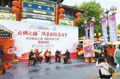 “關(guān)中巷的鄉(xiāng)黨們,陜南街的伙計們,陜北里的后生婆姨們,擼起袖子加油干,今兒個,咱開市大吉”。昨日上午,記者在永興坊陜西非遺美食文化街區(qū)看到,盡顯老陜豪邁風(fēng)格的“開街儀式”吸引了不少游人駐足。永興坊園區(qū)東邊方言字廣場特設(shè)為“2018‘絲綢之路’陜菜國際美食節(jié)”主題宣傳區(qū),匯聚了陜西107區(qū)縣的百余種非遺美食和土特產(chǎn)品。