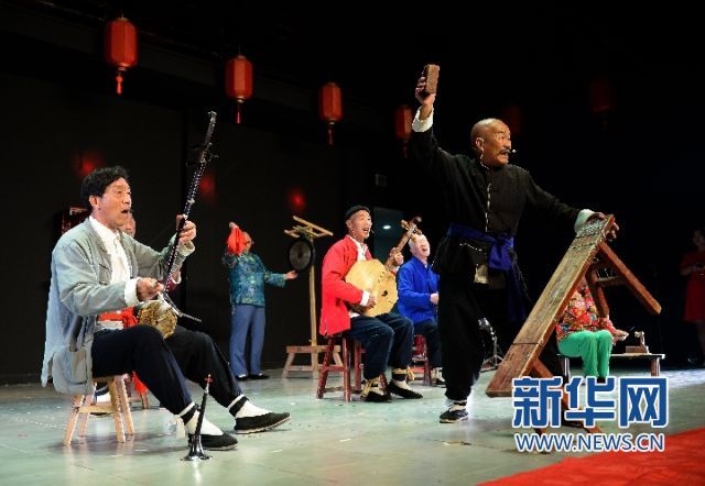 在陜西西安藍(lán)田縣白鹿原影視城,藝人們?cè)诒硌萑A陰老腔(6月9日攝)新華社記者 劉瀟 攝