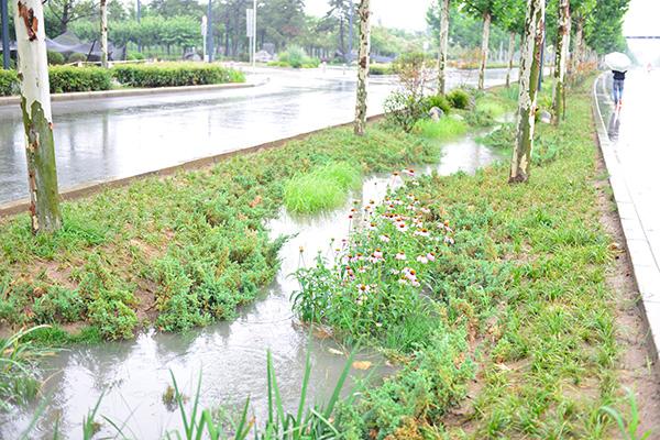 雨天時(shí),雨水從地勢高處流向鋪滿植被的下凹式綠化帶、雨水花園、雨水收集池、綠色屋頂、植草溝等,逐級被消納。多余的未被消納的雨水,則順著植草溝渠流向?yàn)栁餍鲁侵行膮^(qū)域的中央公園。