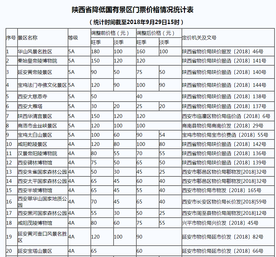 記者9月29日從陜西省物價(jià)局官方網(wǎng)站了解到,“十一”黃金周前夕,陜西省秦始皇帝陵博物院、華清宮、法門寺、黃帝陵、大雁塔、大慈恩寺、乾陵、漢陽陵、西安碑林博物館、陜西牛背梁國家級自然保護(hù)區(qū)等一批國有旅游景區(qū)門票價(jià)格下調(diào),降價(jià)幅度在10%至20%之間。