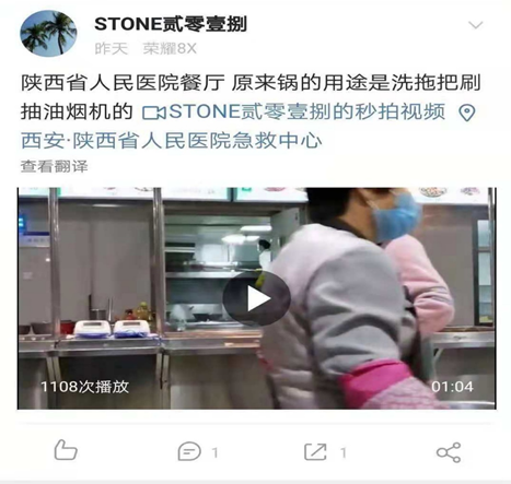 11月6日14:50,“西安直播”等微博號轉發(fā)網友爆料:“11月5號,在西安市某醫(yī)院食堂內,清潔人員站在灶臺上在打掃油煙機上的污漬時,竟直接把清潔油煙機的拖把放到灶臺上的鍋里清洗,絲毫不避諱外面的食客。目前,餐廳方面對此還未作出回應!贝艘曨l同時被“新浪財經”、“深圳商報”等多個媒體官微點名轉發(fā)。