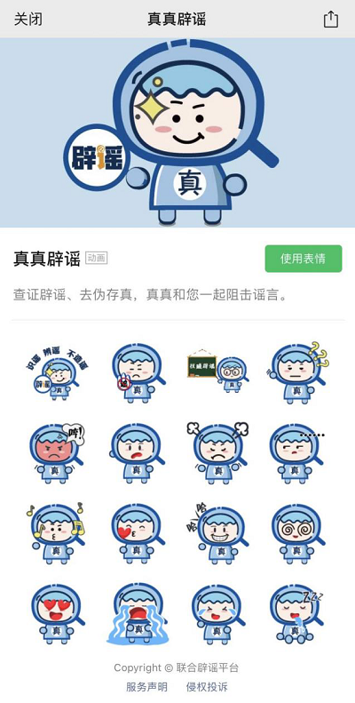 微信表情商店搜索“真真辟謠”,進入表情專輯,點擊“使用表情”,即可使用。