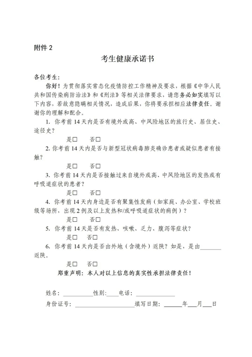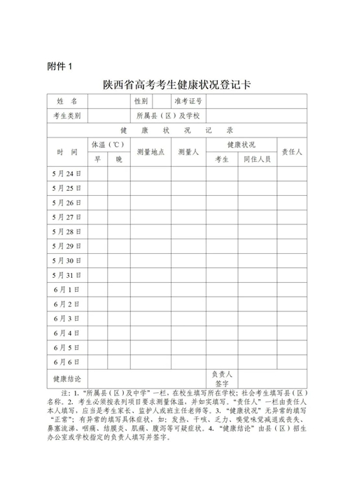 健康監(jiān)測。考生在高考前14天到高考結(jié)束應(yīng)進入靜態(tài)管理,堅持做到非必要不流動,不到人群流動性較大的場所活動,不接觸有疫情風險的人員,做好每日體溫測量、記錄并進行健康狀況監(jiān)測,填寫《陜西省高考考生健康狀況登記卡》(附件1)和《考生健康承諾書》(附件2)?忌】等绯霈F(xiàn)異常狀況應(yīng)立即向?qū)W校和高考報名地考試機構(gòu)報告,不得謊報、瞞報。