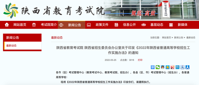 5月25日,陜西省教育考試院、陜西省招生委員會辦公室印發(fā)了《2022年陜西省普通高等學(xué)校招生工作實(shí)施辦法》,明確了陜西2022年高考考試、評卷、志愿填報(bào)招生錄取等政策。
