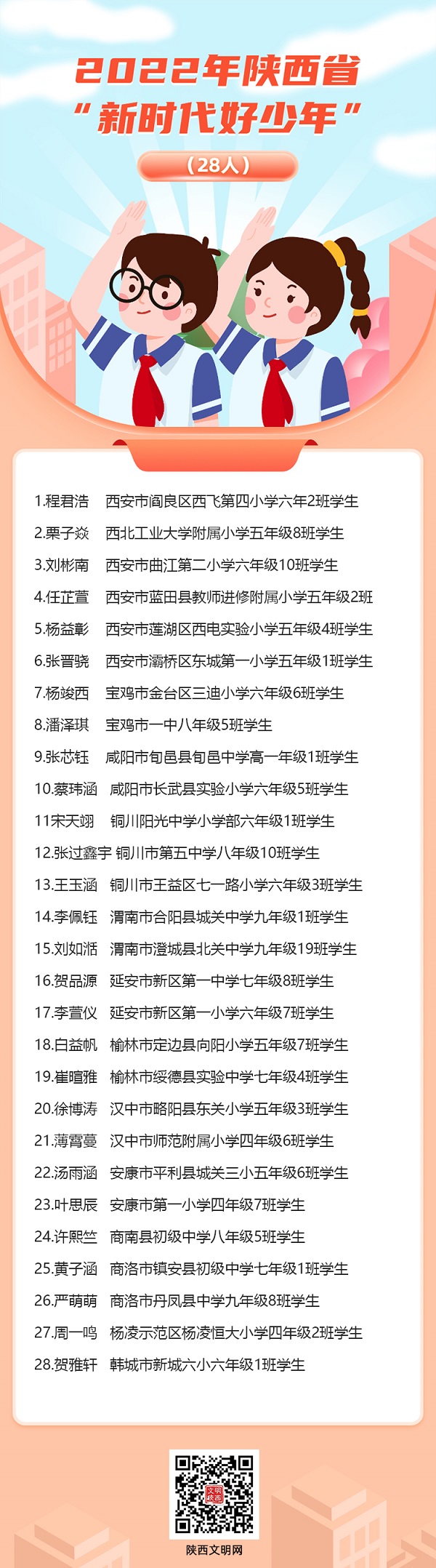 為深入貫徹落實習(xí)近平新時代中國特色社會主義思想,圍繞立德樹人根本任務(wù),積極培育和踐行社會主義核心價值觀,幫助青少年“扣好人生第一?圩”,培養(yǎng)德智體美勞全面發(fā)展的社會主義建設(shè)者和接班人,進(jìn)一步宣傳展示、學(xué)習(xí)弘揚新時代陜西少年的良好品德和時代風(fēng)貌。今年3月至5月,省委文明辦、省教育廳、團(tuán)省委、省婦聯(lián)在全省開展了 “尋找 學(xué)習(xí) 宣傳、爭做新時代好少年”活動。經(jīng)自下而上逐級推薦審核、網(wǎng)上學(xué)習(xí)評議、專家評審,擬確定程君浩等28名少年為2022年陜西省“新時代好少年”,現(xiàn)將名單予以公示,接受社會公眾監(jiān)督。