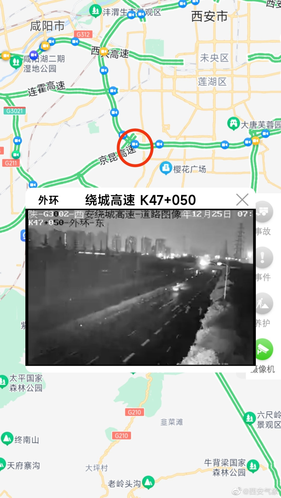 據(jù)西安氣象最新預(yù)報,配合雷達實況選取了西三環(huán)環(huán)城高速監(jiān)控視頻可以看到已經(jīng)在下了,截圖不太明顯;西漢、藍(lán)商高速已經(jīng)在下并且有些路段有積雪,今日出行的小伙伴除了防寒保暖,還請注意道路安全。
