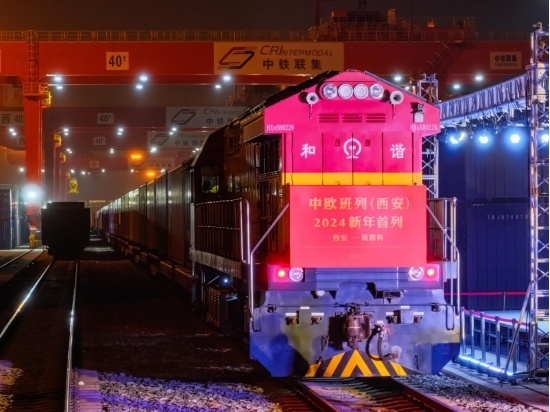 2024年元旦零點(diǎn)整,伴隨著悠揚(yáng)汽笛聲,中歐班列長安號2024年首趟班列從西安國際港站始發(fā)。班列55個(gè)集裝箱滿載紙塑鋁復(fù)合材料和百貨等,經(jīng)阿拉山口口岸出境,將最終抵達(dá)俄羅斯莫斯科,此次“跨國旅程”約7206公里,全程運(yùn)行13天。