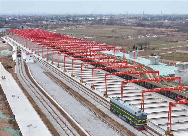 1月21日,中鐵十一局西延高鐵閻良鋪軌基地(無(wú)人機(jī)照片)。 當(dāng)日,隨著一列運(yùn)載500米長(zhǎng)鋼軌的列車(chē)駛?cè)胫需F十一局西延高鐵閻良鋪軌基地,西(安)延(安)高鐵進(jìn)入存軌施工階段,為后續(xù)鋪軌工作奠定基礎(chǔ)。項(xiàng)目建成后,西安至延安的運(yùn)行時(shí)間將從目前的2.5小時(shí)縮短至1小時(shí)左右。 新華社記者 張博文攝