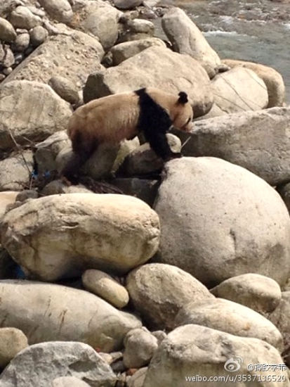 大熊貓受到驚嚇徘徊在河邊。(圖片來源于網(wǎng)絡)