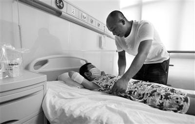 張明龍在醫(yī)院照顧孩子 記者 代澤均攝 結(jié)婚前,他知道她有一個患重病的兒子,他毅然承諾:不管有多苦,和她一起給孩子看好玻兩年來,90后裝修工繼父,為了給孩子……