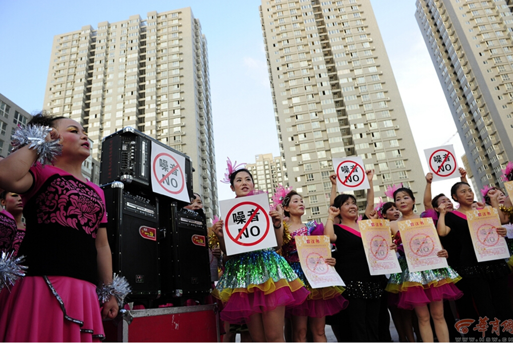 昨晚7時許,西安市未央?yún)^(qū)百花家園小區(qū),眾多廣場舞愛好者一起向廣場舞的音箱貼標語,向噪音說“No”。跳廣場舞十多年的席云霞說:“我十分喜歡跳廣場舞,不……