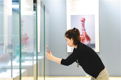 圖為一位觀眾在拍攝國(guó)家級(jí)非物質(zhì)文化遺產(chǎn)代表性傳承人任星航的鈞瓷作品。iuN安康新聞網(wǎng)