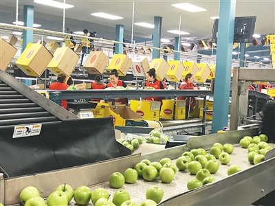 | 美國華盛頓州著名水果產(chǎn)地韋納奇的Auvi 果品公司包裝廠的自動生產(chǎn)線,對剛釆摘下來的青蘋果進行清洗、質(zhì)量檢測、上蠟、包裝等一條龍加工流程,然后通過中國電商平臺天貓快遞到中國消費者手中。 |