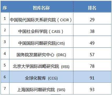 中國現(xiàn)代國際關(guān)系研究院、中國社會科學(xué)院等七個(gè)中國智庫上榜,其中,CCG上榜2017年全球頂級智庫百強(qiáng)榜單第91位,成為中國首個(gè)入選世界百強(qiáng)的社會智庫。