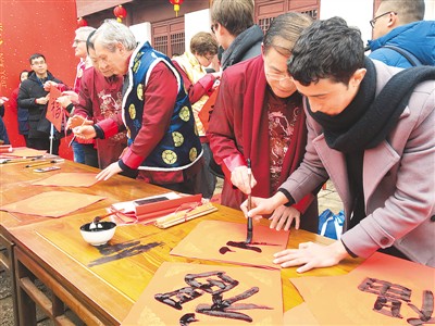 在這次體驗(yàn)活動的現(xiàn)場,不僅有查理這種第一次來到中國的國際友人,也有像夏波波這樣在中國已經(jīng)待上一段時間的老朋友。來到中國一年半,夏波波坦言,“我住在廣州市中心區(qū)域,平時見不到這么多有意思的傳統(tǒng)事物。來到青田,才第一次見識了中國傳統(tǒng)的新年!备吒邟炱鸬募t燈籠、門楣上貼著的紅對聯(lián),還有各式口味的地方小吃,都讓他感到無比新奇!暗谝淮螌憣β(lián)有點(diǎn)難,但是我寫得很開心。中國的新年很熱鬧,你看,這里的所有人都玩得很開心,我喜歡這樣的氛圍!
