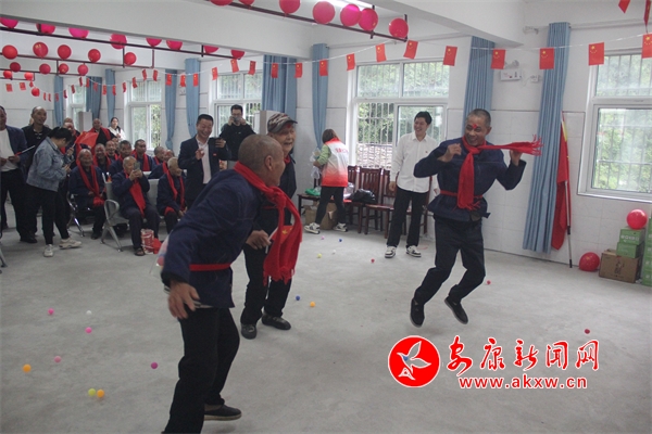 △ 構(gòu)朳鎮(zhèn)組織敬老院的老人們做趣味游戲