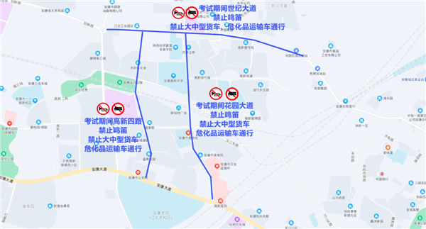 1、花園大道(安康大道至世紀(jì)大道)、世紀(jì)大道(新路口環(huán)島至五路口環(huán)島)、高新四路,所有通行車輛于6月6日21時至6月8日21時,無論遇到何種情況,一律禁止鳴笛,禁止大中型貨車、;愤\輸車通行。