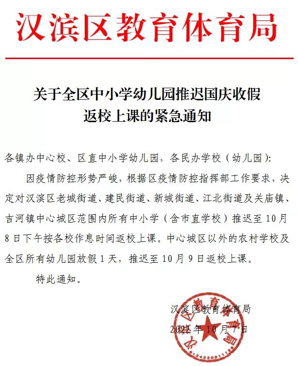 本網(wǎng)訊  漢濱區(qū)教育體育局發(fā)布緊急通知,因疫情防控形勢(shì)嚴(yán)峻,根據(jù)區(qū)疫情防控指揮部工作要求,決定對(duì)漢濱區(qū)老城街道、建民街道、新城街道、江北街道及關(guān)廟鎮(zhèn)、吉河鎮(zhèn)中心城區(qū)范圍內(nèi)所有中小學(xué)(含市直學(xué)校)推遲至10月8日下午按各校作息時(shí)間返校上課。中心城區(qū)以外的農(nóng)村學(xué)校及全區(qū)所有幼兒園放假1天,推遲至10月9日返校上課。C9H安康新聞網(wǎng)