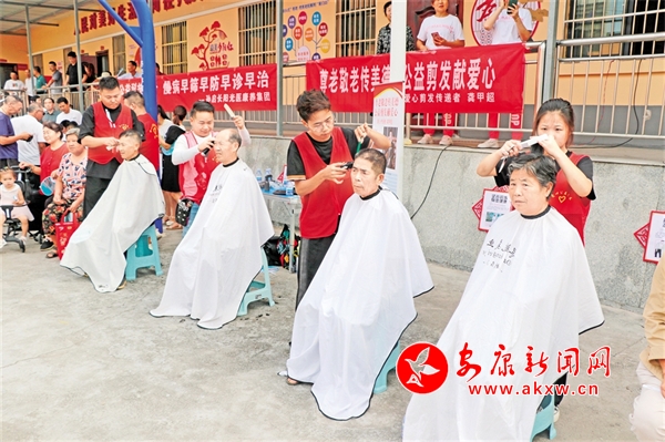 現(xiàn)場,通過有獎問答、發(fā)放宣傳資料、設(shè)立咨詢臺等形式,向村民進(jìn)行平安建設(shè)、普法、反詐等宣傳。來自漢濱區(qū)陽光愛心護(hù)理院的志愿者們?yōu)槔先藗兲峁┙】抵笇?dǎo)。愛心人士龔甲超組織的義剪活動也受到了老人們的歡迎,志愿者們免費(fèi)為現(xiàn)場50多名老人理發(fā)。書法家們現(xiàn)場圍繞“孝義”主題進(jìn)行創(chuàng)作,并贈送給群眾。演出結(jié)束后,近百名老人到社區(qū)的孝義食堂參觀和免費(fèi)用餐。