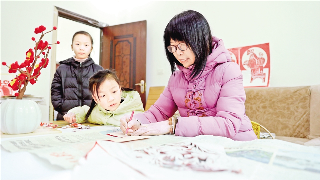 馮增慧教兩個孫女學(xué)剪紙 羅妍 攝