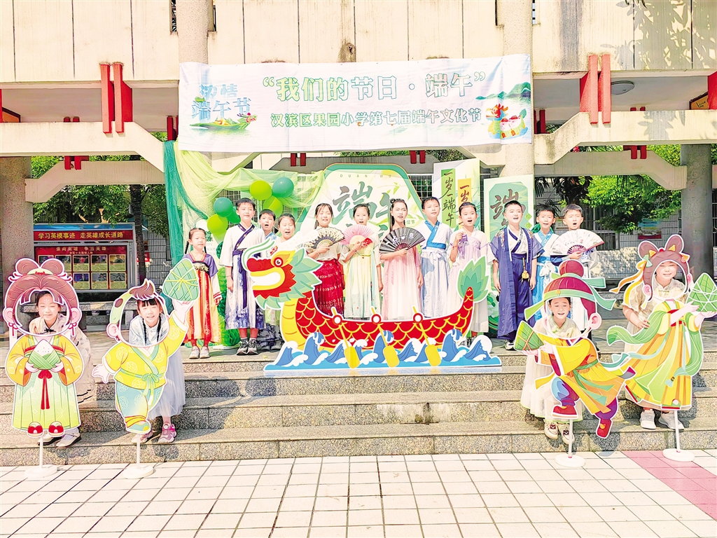 學(xué)生們身著漢服與“我們的節(jié)日·端午”主題文化節(jié)背景墻合影