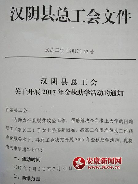 安康新聞網(wǎng)訊(通訊員 儲(chǔ)毅)為助力全縣脫貧攻堅(jiān)工作,幫助解決今年考上大學(xué)的困難職工(農(nóng)民工)子女上學(xué)實(shí)際困難,提高工會(huì)困難幫扶工作精準(zhǔn)化服務(wù)水平。日前,漢陰縣總工會(huì)印發(fā)了《關(guān)于開(kāi)展2017年金秋助學(xué)活動(dòng)的通知》。