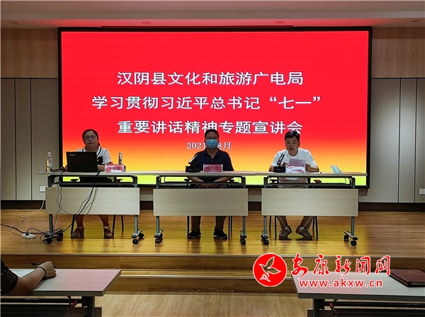 本網(wǎng)訊(通訊員 成濤)為深入學(xué)習(xí)宣傳貫徹習(xí)近平總書記在慶祝中國共產(chǎn)黨成立100周年大會上的重要講話精神,引導(dǎo)廣大黨員干部深刻領(lǐng)會把握“七一”重要講話的重大意義。8月11日下午,漢陰縣文化和旅游廣電局舉辦學(xué)習(xí)貫徹習(xí)近平總書記“七一”重要講話精神專題宣講會。