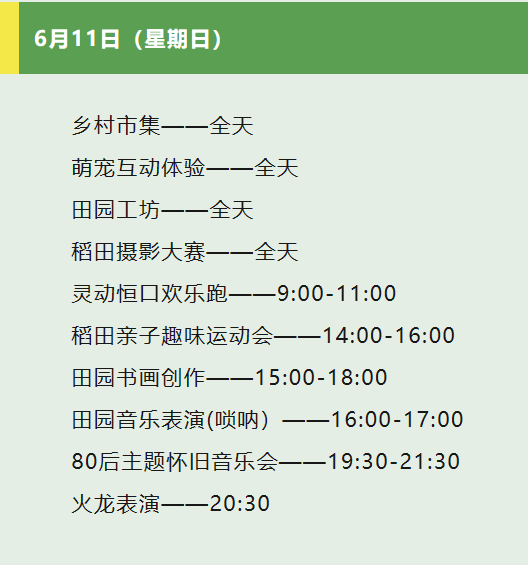 當(dāng)日,現(xiàn)場還舉辦了稻田拔河、稻田摸魚、稻田摔跤等娛樂活動和田園古箏表演、70后主題懷舊音樂會、火龍表演等演出活動,吸引眾多游客朋友前來打卡。6月11日,靈動恒口歡樂跑、親子趣味運動會、嗩吶音樂表演、80后主題懷音樂會等活動精彩繼續(xù)......