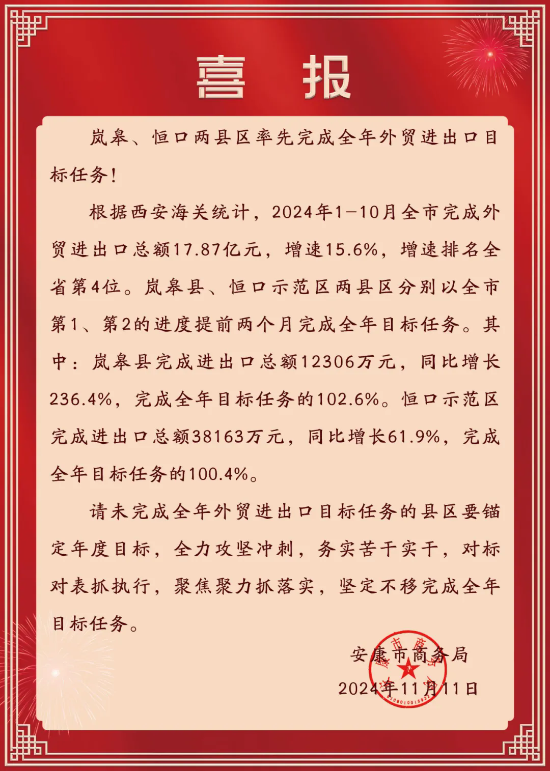 近日,市商務(wù)局發(fā)來喜報,恒口示范區(qū)率先完成全年外貿(mào)進(jìn)出口目標(biāo)任務(wù)。