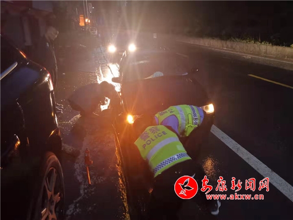 本網(wǎng)訊(通訊員 翁玲 蘆寶)2019年9月17日晚八點(diǎn)左右,風(fēng)雨交加,嵐皋縣公安局交警大隊(duì)香河口中隊(duì)民警在轄區(qū)夜間巡查,巡邏至G211國道1081公里處,發(fā)現(xiàn)一輛渝A牌照的小型轎車輪胎卡在路面溝渠里不能移動(dòng),加之雨夜視線差,路面濕滑,過路車輛多,十分危險(xiǎn)。