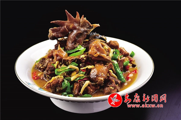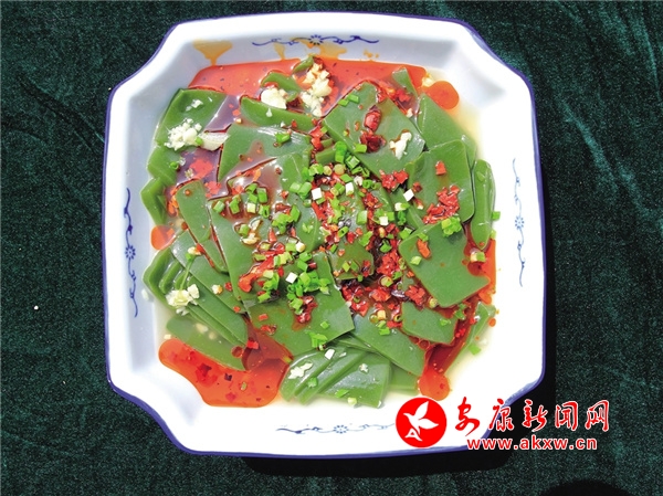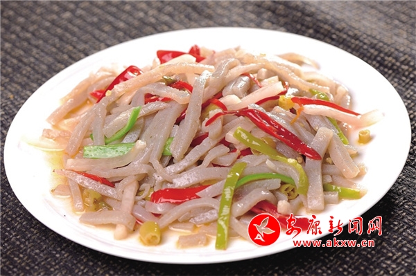 酸辣魔芋:是嵐皋特色名菜,也是當?shù)胤沁z項目之一。以秋收后鮮魔芋漿汁為原料,加入堿水煮制,冷固后呈豆腐形狀,切塊后與當?shù)嘏莶艘黄鸫蠡鸱炊。魔芋中?ldquo;堿”和泡菜中的“酸”完美結(jié)合,具有保護腸胃、排毒養(yǎng)顏、減肥瘦身的功效,同時還能降血糖、降血脂、降血壓。嵐皋民諺“要見好公婆,多吃鬼腦殼”,說的是姑娘吃了魔芋豆腐,瘦體健身、容光煥發(fā),能得到公婆的好感,F(xiàn)代醫(yī)學認為,魔芋豆腐中含量最大的葡萄甘露聚糖,具有強大的膨脹力,超過任何一種植物膠的黏韌度,既可填充胃腸,消除饑餓感,又因所含熱量微乎其微,故能控制體重、減肥健美。此外,魔芋豆腐既能開胃化食,又能清除腸道垃圾,有防癌抗癌的神奇魔力,享有“防癌魔衣”“神奇食品”的美譽。