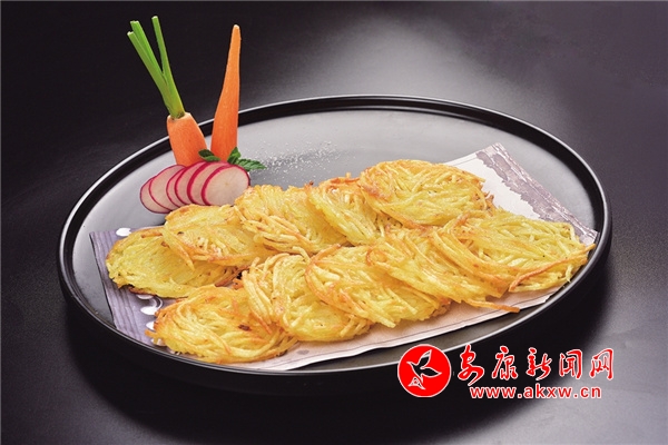 土豆絲餅:用嵐皋當?shù)氐耐炼骨薪z,混入面糊,再用油煎炸出鍋,色澤金黃,清香酥脆,回味無窮。