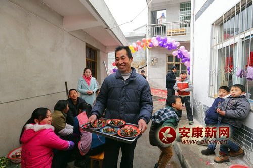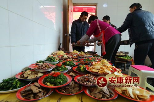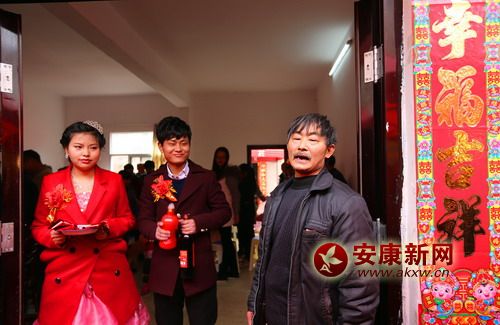 這時,新郎家是最熱鬧的,為了辦好婚禮,附近的親朋好友一一前來幫忙和捧人氣。新郎的家里搭起了氣球彩門,紅紅的對聯(lián)和喜字分別貼在窗戶和門上,院壩里架起了大蒸籠,八大碗早就上了籠,涼菜在案板上整整齊齊的一溜溜擺著;ㄉ⒐献、糖果一一擺在屋子里、院壩里的十來張大圓桌上。按照墻上貼著的執(zhí)事單的安排,廚房、客廳、禮房等每個角落的人都在干著自己的事情。寒冬里的婚禮,沒有人喊累,嚴寒在這一刻被驅(qū)散。