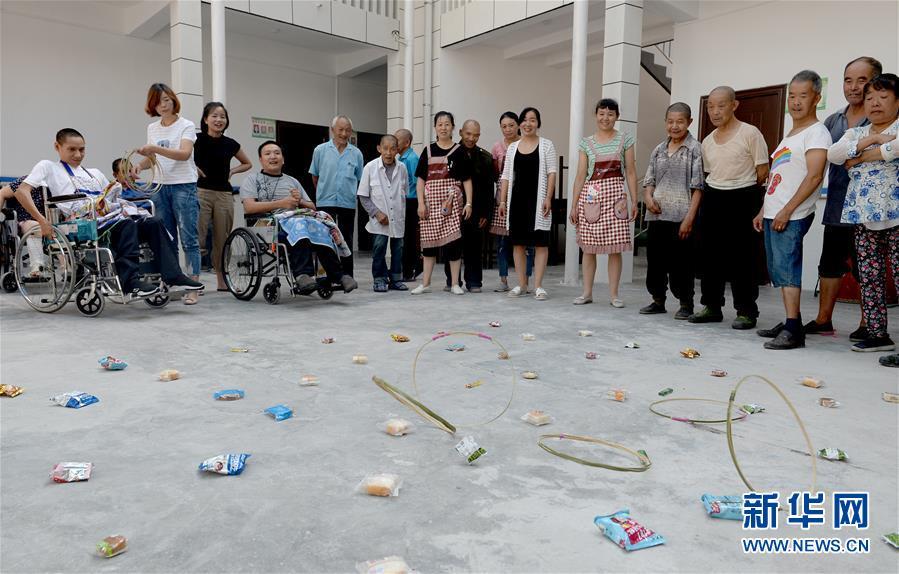寧陜縣中心敬老院五保失能托養(yǎng)中心內(nèi),托養(yǎng)人員在一起進(jìn)行套圈游戲(8月20日)。 自2016年9月起,陜西寧陜縣開始實(shí)行貧困失能、半失能人員集中供養(yǎng),為其提供干凈舒適的住所、24小時(shí)全面護(hù)理,不僅讓貧困失能、半失能人員得到良好照料,也徹底將失能家庭解放出來,全身心脫貧致富奔小康。目前,寧陜登記在冊貧困失能、半失能人員共有467人,其中320人已分別在全縣4個(gè)敬老院的五保失能托養(yǎng)中心內(nèi)進(jìn)行集中供養(yǎng),剩余人員將于托養(yǎng)中心床位逐步完善后全部入住。 新華社記者 劉瀟 攝