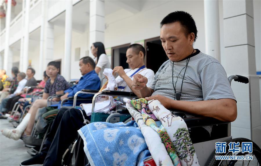 寧陜縣中心敬老院五保失能托養(yǎng)中心內(nèi),托養(yǎng)人員張朝兵(右一)、何永龍(右二)在繡十字繡(8月20日攝)。張朝兵、何永龍都在意外事故中造成高位截癱,家中無人照料。進入托養(yǎng)中心后他們開始學(xué)習(xí)繡十字繡,除了政府補助之外還能通過自己的手藝補貼家用。 yCp安康新聞網(wǎng)