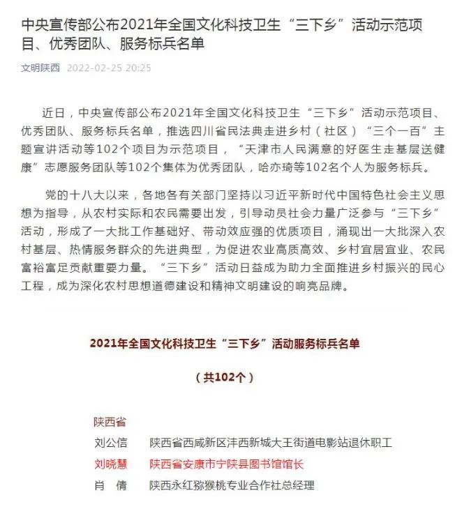 近日,中央宣傳部公布2021年全國文化科技衛(wèi)生“三下鄉(xiāng)”活動示范項(xiàng)目、優(yōu)秀團(tuán)隊(duì)、服務(wù)標(biāo)兵名單,推選四川省民法典走進(jìn)鄉(xiāng)村(社區(qū))“三個一百”主題宣講活動等102個項(xiàng)目為示范項(xiàng)目,“天津市人民滿意的好醫(yī)生走基層送健康”志愿服務(wù)團(tuán)隊(duì)等102個集體為優(yōu)秀團(tuán)隊(duì),哈亦琦等102名個人為服務(wù)標(biāo)兵。其中,寧陜縣圖書館長劉曉慧獲評2021年全國文化科技衛(wèi)生“三下鄉(xiāng)”活動服務(wù)標(biāo)兵。