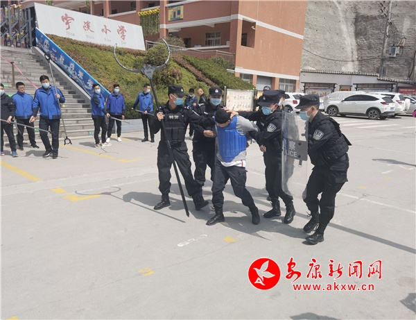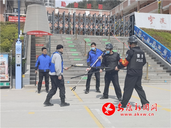 演練開始,下午1點(diǎn)30分,入校音樂響起,兩名校警、家長(zhǎng)護(hù)衛(wèi)隊(duì)、值班老師站在校門口執(zhí)勤,大部分學(xué)生已進(jìn)入校園,還有十幾名學(xué)生正在排隊(duì)等待入校。此時(shí),在學(xué)校旁邊閱讀吧門口徘徊的一名身份不明的“歹徒”突然舉著砍刀沖向校門口,企圖闖入校園,值班校警見狀立即啟動(dòng)一鍵式報(bào)警向公安部門求助,值班老師快速做出反應(yīng),拉響學(xué)校警報(bào),關(guān)閉伸縮門,組織未入校的學(xué)生趕往緊急避難場(chǎng)地躲避。同時(shí),校警和值班老師手持器械,在校門口對(duì)“歹徒”進(jìn)行阻擊,拖延時(shí)間。RvL安康新聞網(wǎng)