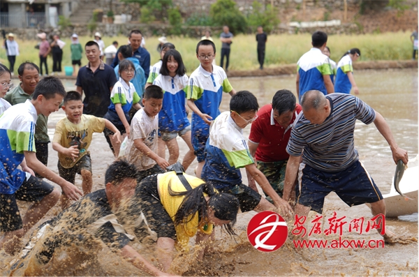 插秧比賽后緊接著開展了拔河比賽,參賽者們光著腳在泥濘的田里奮力拉扯,你來我往,互不相讓,田邊的觀眾則奮力地為自己支持的隊(duì)伍加油鼓勁。稻田抓鴨捕魚活動讓現(xiàn)場氣氛更加熱烈,觀眾紛紛脫下鞋襪,卷起褲腿,在稻田中追逐游魚和鴨子,歡快的笑聲此起彼伏。