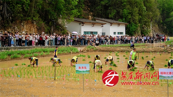 10點(diǎn)50分,插秧比賽正式開始,只見寨溝村、龍泉村、漁灣村、湯坪村四支隊(duì)伍在水田中依次排開。 隨著清脆的哨響,四支插秧隊(duì)伍迅速進(jìn)入狀態(tài),水田瞬間化作激烈的賽場。彎腰俯身,左手攥緊秧苗,右手分秧、插秧,一株株嫩綠的秧苗被精準(zhǔn)插入田中,泥水飛濺間,選手們你追我趕,汗水與歡笑交織,將傳統(tǒng)農(nóng)事活動演繹成了一場精彩絕倫的視覺盛宴。