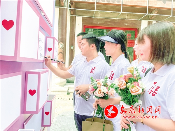 “和氣致祥”“真愛(ài)長(zhǎng)春”“和鳴盛世”等書法作品為新人送上美好祝愿,以此倡導(dǎo)文明、健康、理性的婚戀觀和家庭觀,引導(dǎo)新人們感悟銘記婚姻締結(jié)之神圣、婚姻家庭之責(zé)任、婚姻和諧之美好,樹(shù)立社會(huì)新風(fēng)尚。“穿針乞巧”“曬書曬才”“編中國(guó)結(jié)”……一對(duì)對(duì)新人積極踴躍、各顯神通。手執(zhí)五色絲線,同時(shí)連續(xù)穿過(guò)五孔針,比一比誰(shuí)能最先將線快速全部穿過(guò)針孔,期待“得巧”;巧手編織中國(guó)結(jié),傳承紅色中國(guó)情,七夕飛花與詩(shī),情意綿綿,深遠(yuǎn)悠長(zhǎng)。