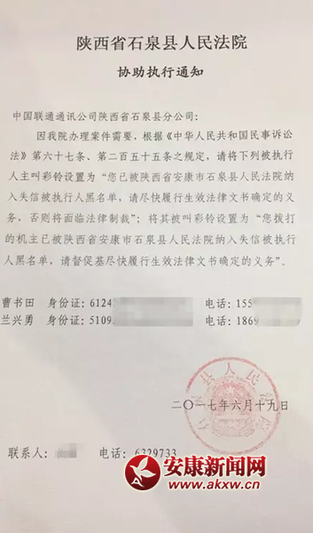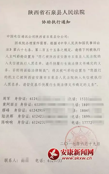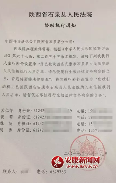 6月19日下午,石泉法院將首批需要進行通信限制的11名“老賴”名單提供給了三大通信公司,要求其協(xié)助執(zhí)行。