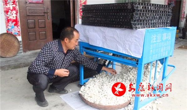 安康新聞網(wǎng)訊(通訊員 沈沙沙 魅力迎豐)“我今年養(yǎng)了20張蠶,在摘繭的時候這臺取繭機可幫了我們家的大忙。”和蔡明勇交談間,他的妻子已快速取下五六片塑框木質(zhì)方格蔟上的蠶繭,簸箕上堆滿了白花花的蠶繭。