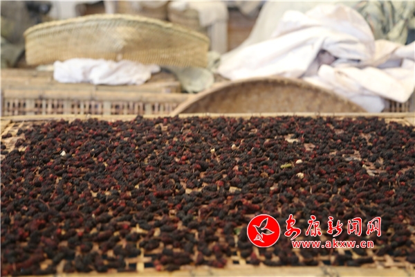 桑葚鮮果保鮮時間短,采摘后不及時銷售便會造成損失。明星村大陽蠶桑支部通過和石泉縣錦絲盛農業(yè)科技有限公司合作,采取“支部+合作社+公司+農戶”的發(fā)展模式,將一部分鮮果通過工廠加工,將銷售價格為5元每斤的新鮮桑葚精選制成桑葚干,桑葚干售價60元每斤;另一部分桑葚釀造成桑葚果酒,還有一部分桑葚可以通過蒸餾古法烤酒的方式制成白酒。以此增加桑葚的附加值,通過提升桑葚的附加值,增加農民的收入。