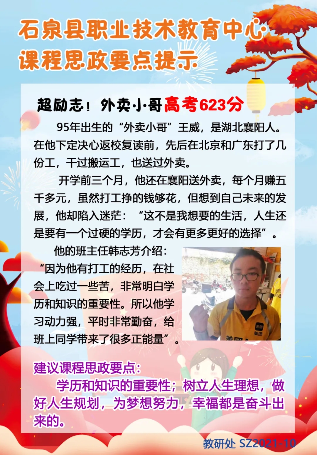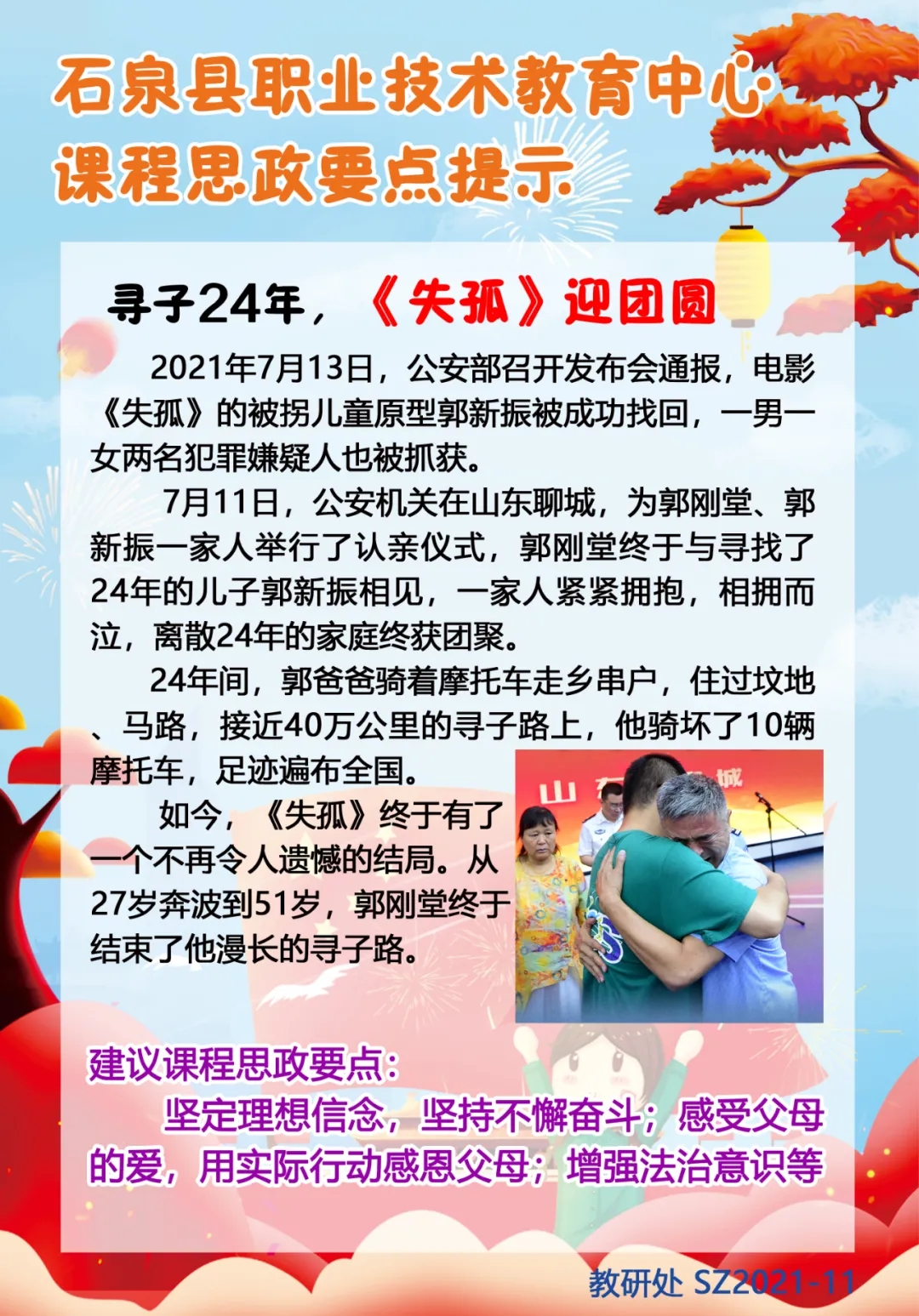 “尋子24年,《失孤》迎團(tuán)圓……建議課程思政要點(diǎn):堅(jiān)定理想信念,堅(jiān)持不懈奮斗;感受父母的愛,用實(shí)際行動(dòng)感恩父母等。”這是石泉縣職教中心正在教師群內(nèi)推送《課程思政要點(diǎn)提示》小卡片。